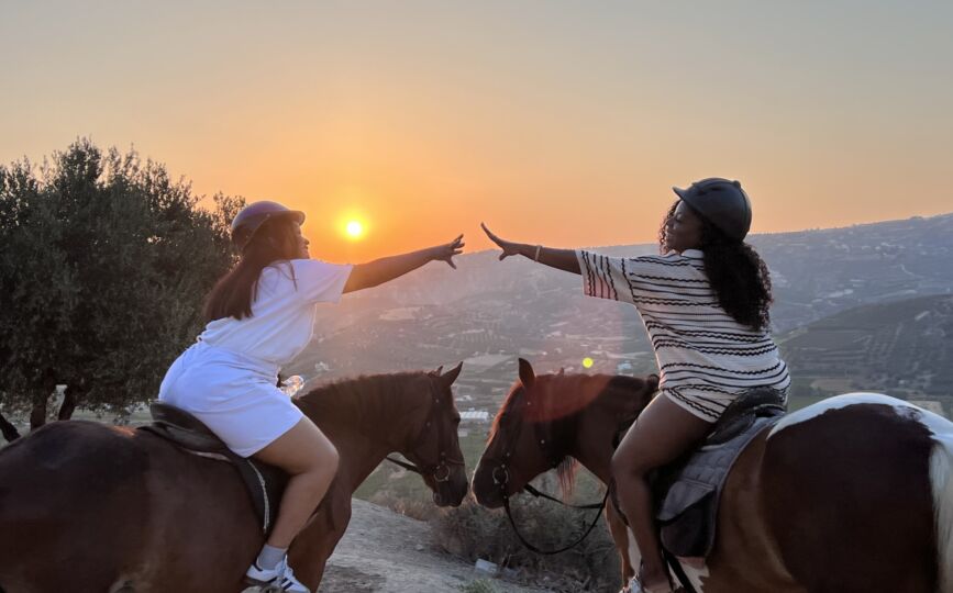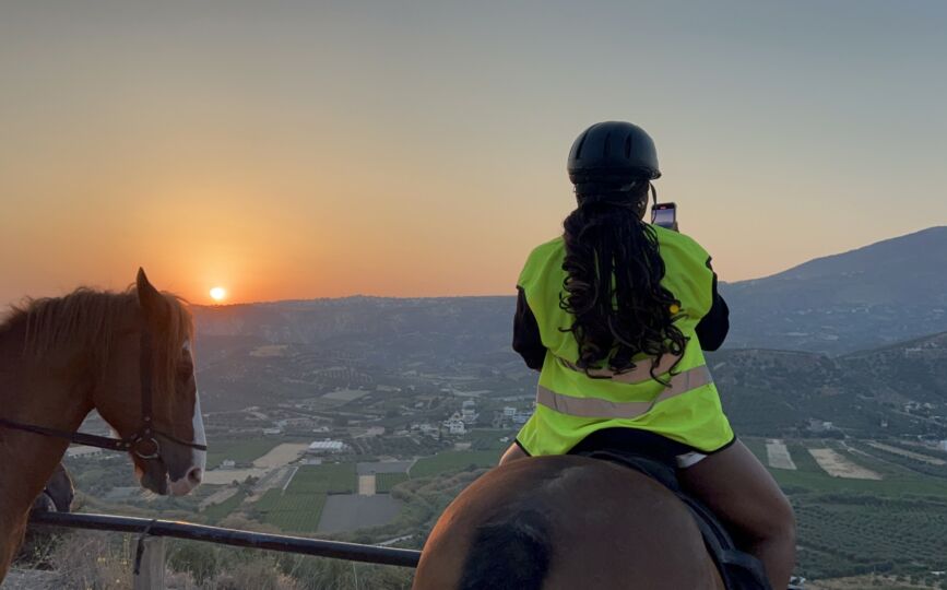 Wear your helmets and join us to explore the Cretan nature in the fields & enjoy a genuine Cretan dinner pic-nic style with the amazing view in the olive groves from the mountain of Heraklion during sunset. Book your trip now and enjoy the panoramic view and the Mediterranean breeze with our horses! Our guides will accompany you to make sure about your safety and take lovely pictures of you and your beloved ones during the golden hour of the sunset!